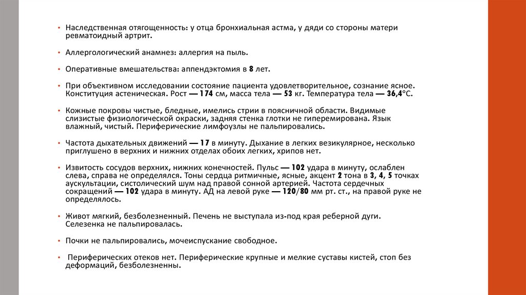 Конституция астеническая. Рост — 174 см, масса тела — 53 кг. Температура тела — 36,4°С.