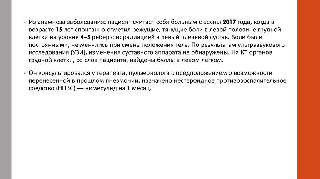 • Из анамнеза заболевания: пациент считает себя больным с весны 2017 года, когда ввозрасте 15 лет спонтанно отметил режущие, тянущие боли в левой половине грудной