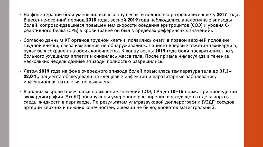 • Летом 2019 года на фоне очередного эпизода болей повысилась температура тела до 37,5–