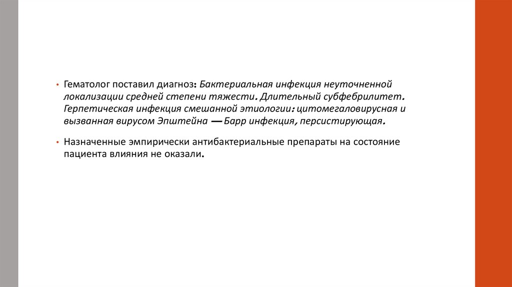 • Гематолог поставил диагноз: Бактериальная инфекция неуточненнойлокализации средней степени тяжести. Длительный субфебрилитет.