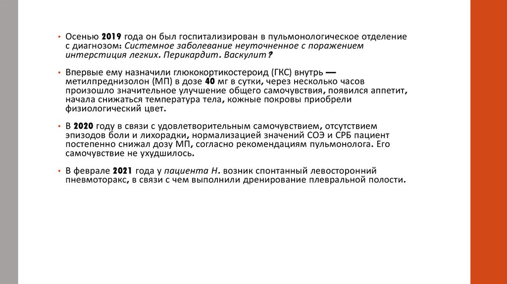 • Осенью 2019 года он был госпитализирован в пульмонологическое отделениес диагнозом: Системное заболевание неуточненное с поражением