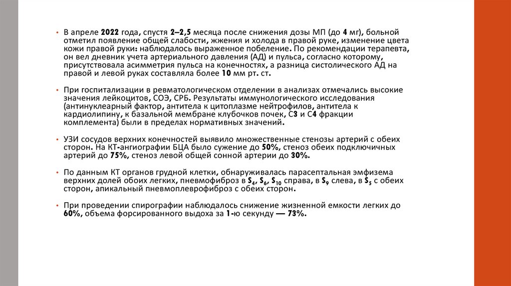 В апреле 2022 года, спустя 2–2,5 месяца после снижения дозы МП (до 4 мг), больной