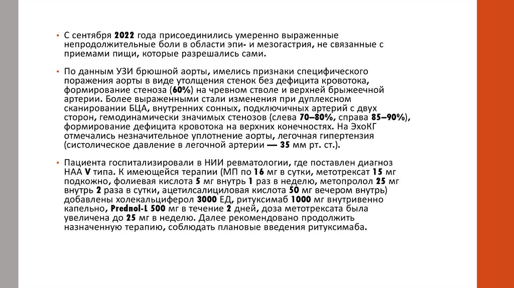 • С сентября 2022 года присоединились умеренно выраженныенепродолжительные боли в области эпи- и мезогастрия, не связанные с