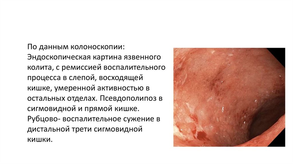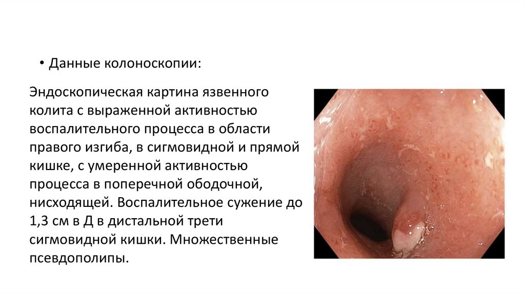 • Данные колоноскопии:Эндоскопическая картина язвенного