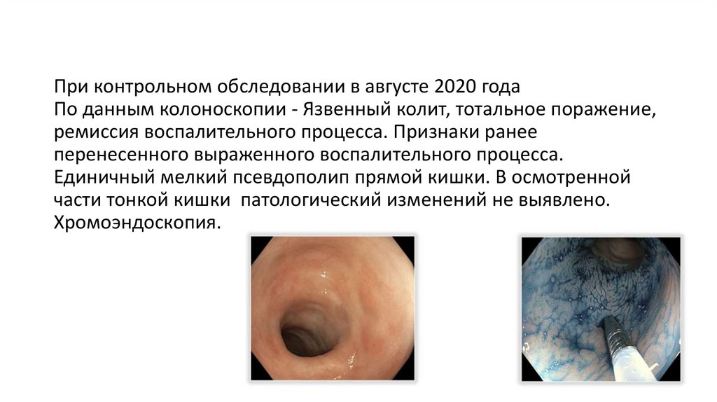 При контрольном обследовании в августе 2020 годаПо данным колоноскопии - Язвенный колит, тотальное поражение,