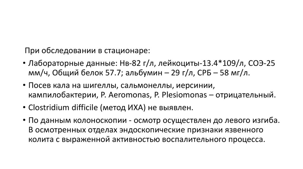 При обследовании в стационаре:• Лабораторные данные: Нв-82 г/л, лейкоциты-13.4*109/л, СОЭ-25