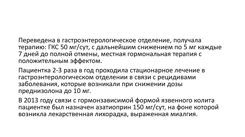 Переведена в гастроэнтерологическое отделение, получалатерапию: ГКС 50 мг/сут, с дальнейшим снижением по 5 мг каждые