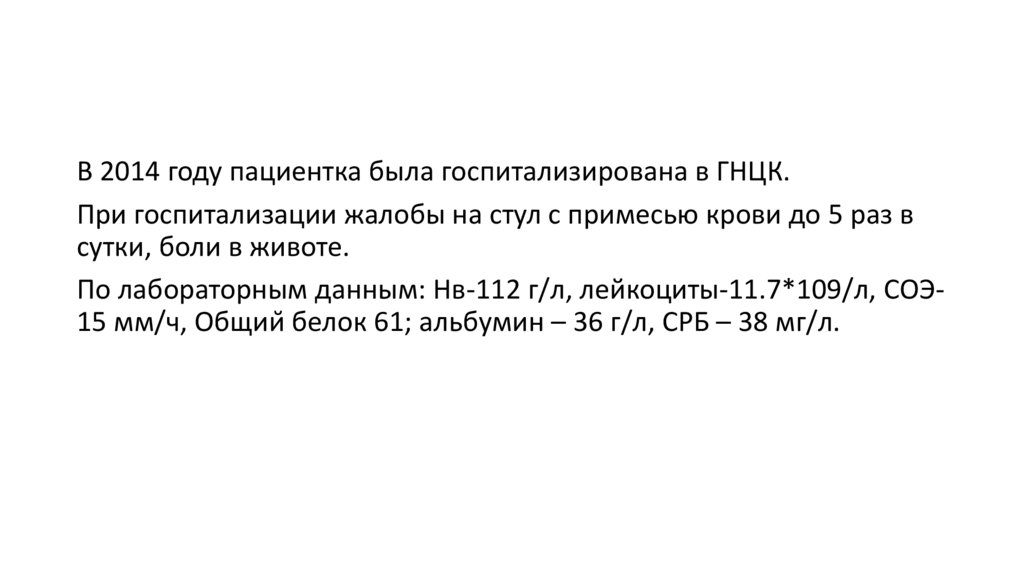 В 2014 году пациентка была госпитализирована в ГНЦК.При госпитализации жалобы на стул с примесью крови до 5 раз в