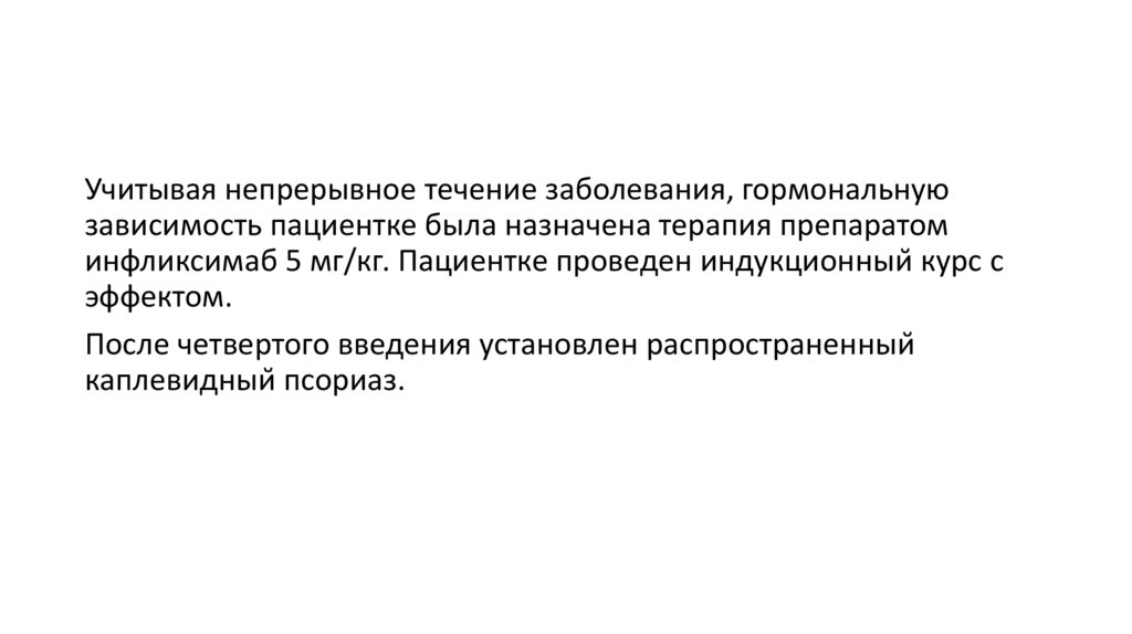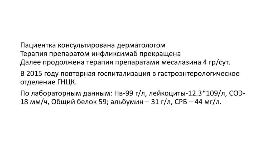 Пациентка консультирована дерматологомТерапия препаратом инфликсимаб прекращена