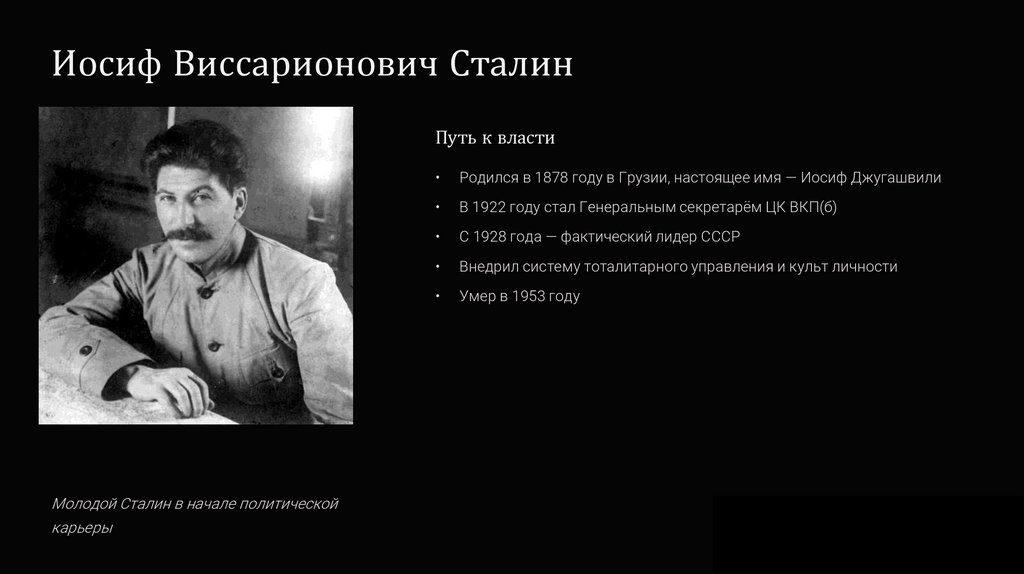 Родился в 1878 году в Грузии, настоящее имя — Иосиф Джугашвили