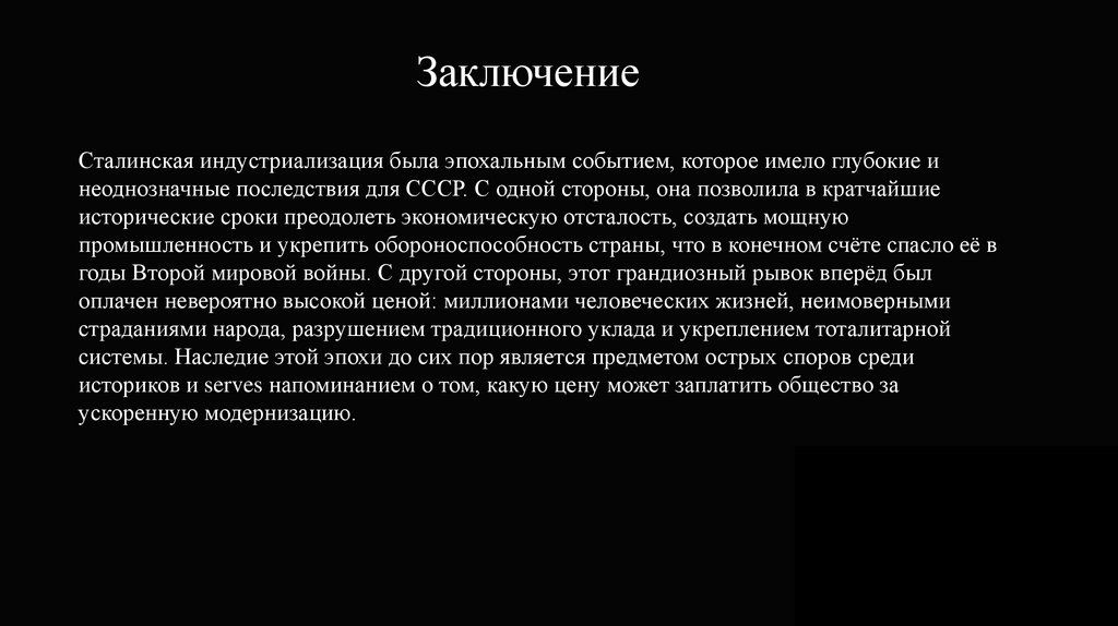ЗаключениеСталинская индустриализация была эпохальным событием, которое имело глубокие и