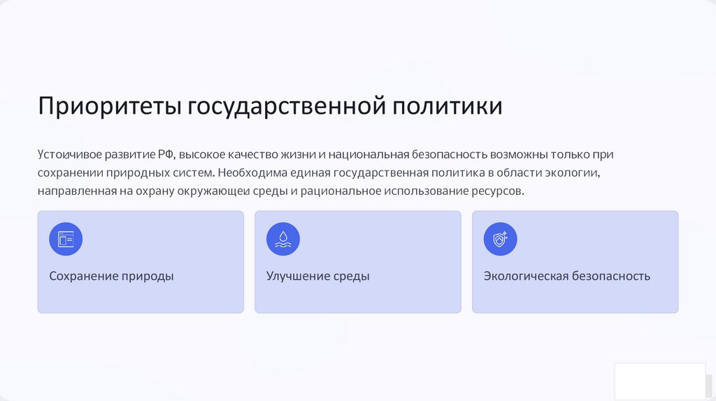 Приоритеты государственной политикиУстойчивое развитие РФ, высокое качество жизни и национальная безопасность возможны только при