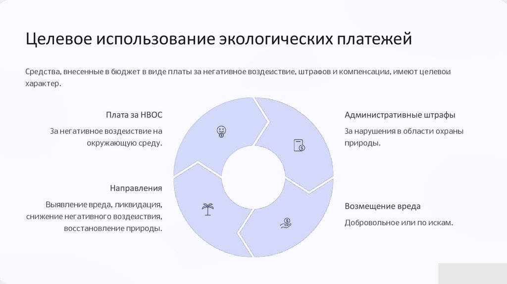 Целевое использование экологических платежейСредства, внесенные в бюджет в виде платы за негативное воздействие, штрафов и компенсаций, имеют целевой