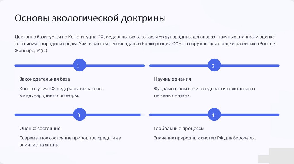 Основы экологической доктриныДоктрина базируется на Конституции РФ, федеральных законах, международных договорах, научных знаниях и оценке