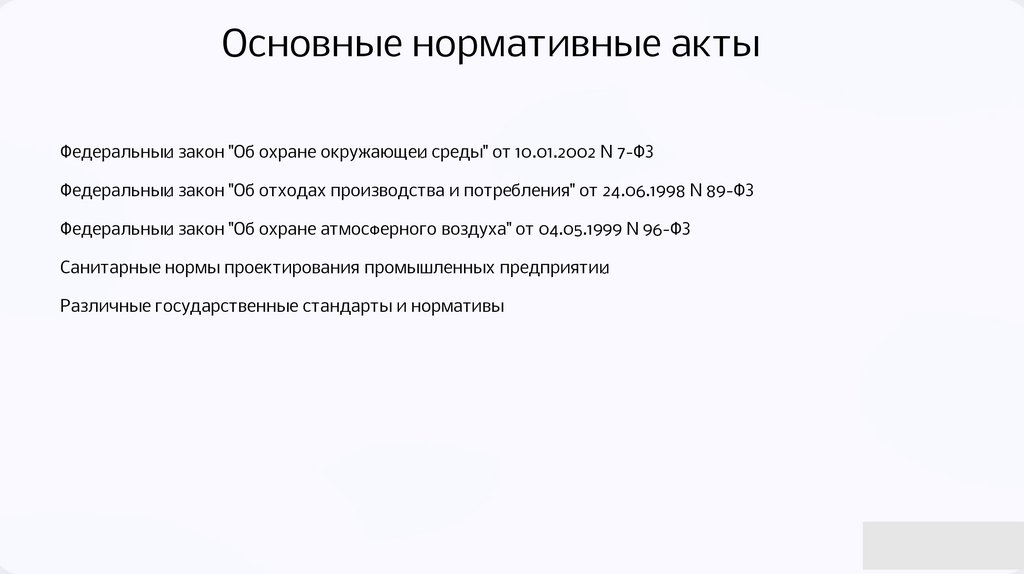 Основные нормативные актыФедеральный закон "Об охране окружающей среды" от 10.01.2002 N 7-ФЗ