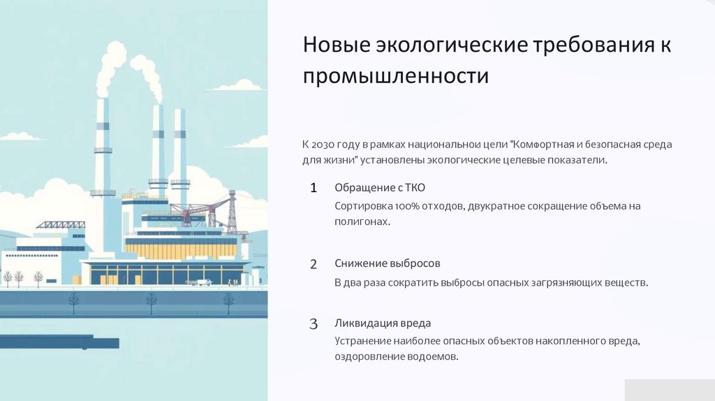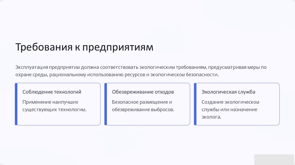 Требования к предприятиямЭксплуатация предприятий должна соответствовать экологическим требованиям, предусматривая меры по
