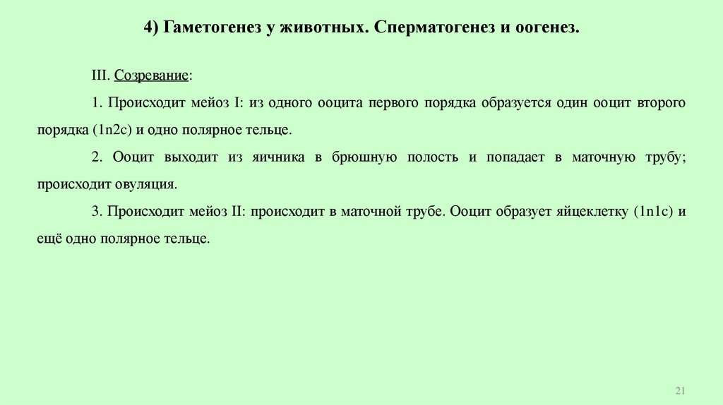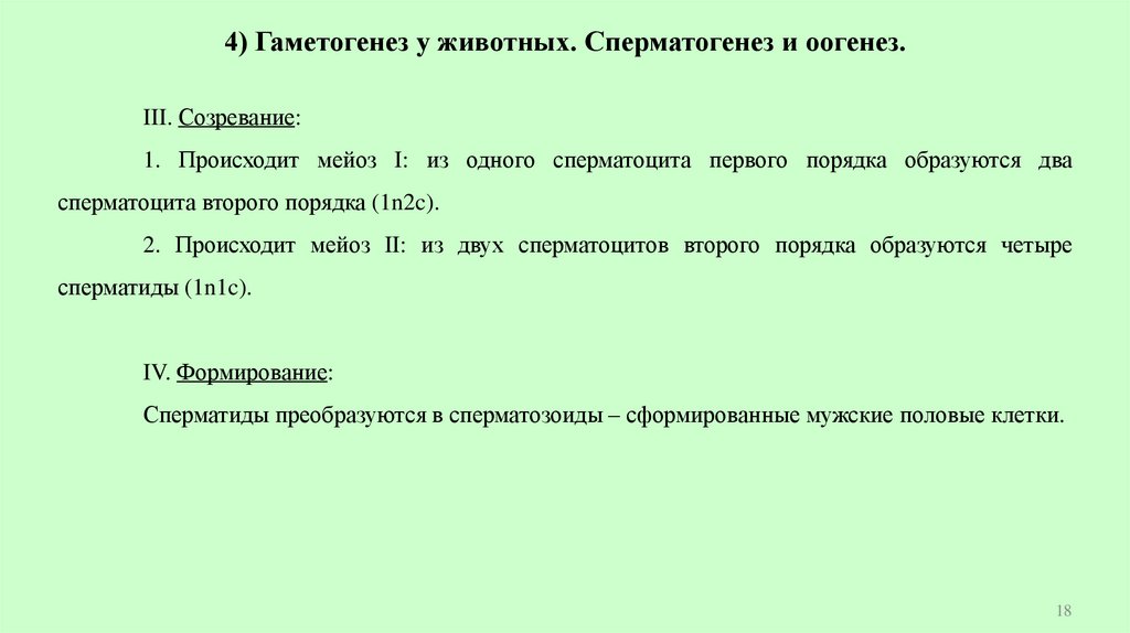 4) Гаметогенез у животных. Сперматогенез и оогенез.III. Созревание: