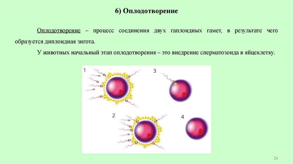 6) ОплодотворениеОплодотворение – процесс соединения двух гаплоидных гамет, в результате чего