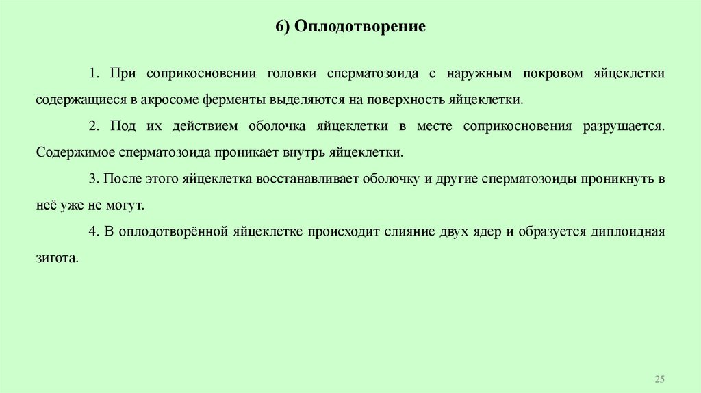6) Оплодотворение1. При соприкосновении головки сперматозоида с наружным покровом яйцеклетки