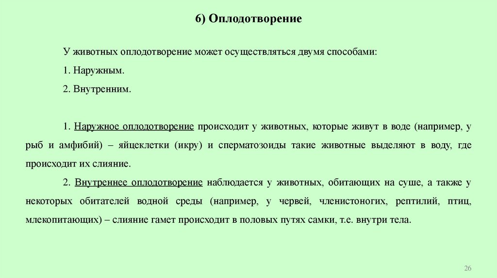 6) ОплодотворениеУ животных оплодотворение может осуществляться двумя способами: