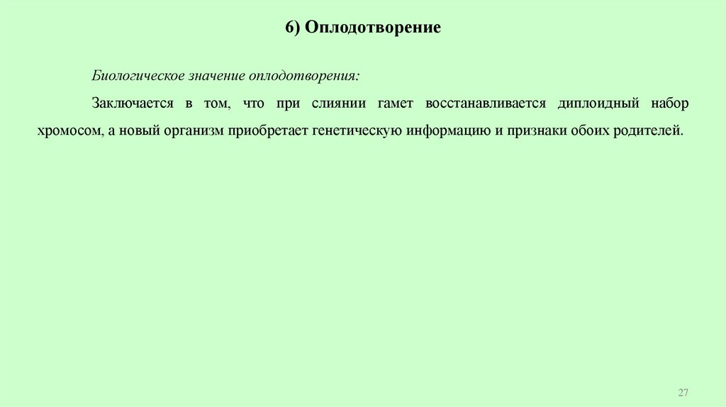 6) ОплодотворениеБиологическое значение оплодотворения: