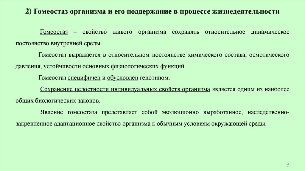 Явление гомеостаза представляет собой эволюционно выработанное, наследственнозакрепленное адаптационное свойство организма к обычным условиям окружающей среды.