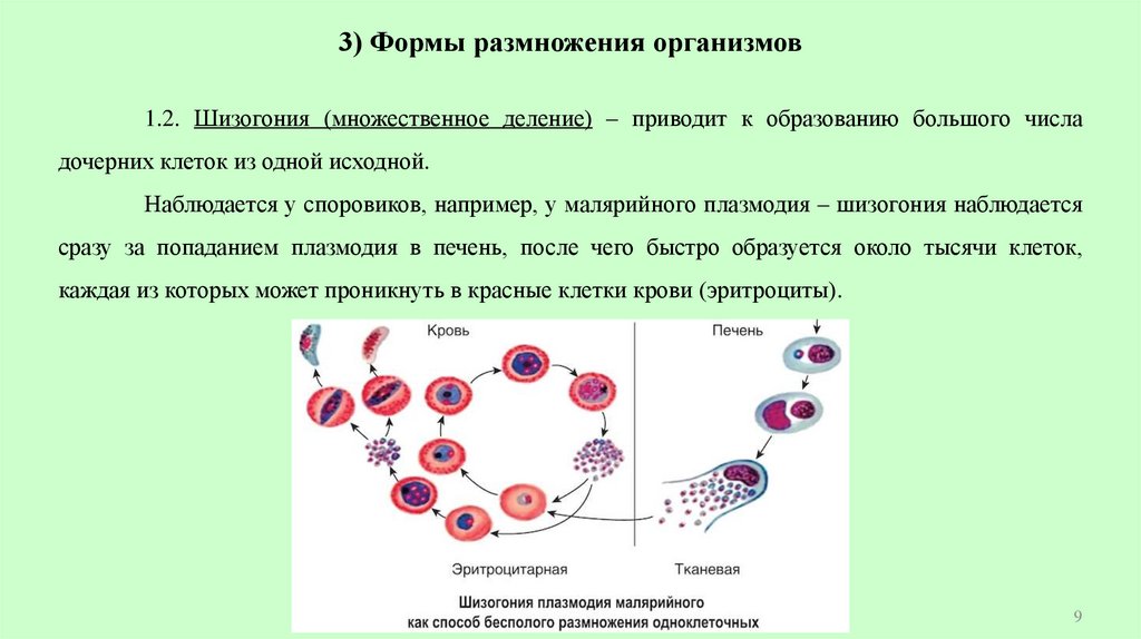 3) Формы размножения организмов1.2. Шизогония (множественное деление) – приводит к образованию большого числа