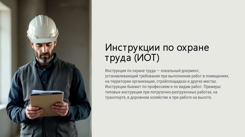 Инструкции бывают по профессиям и по видам работ. Примеры: