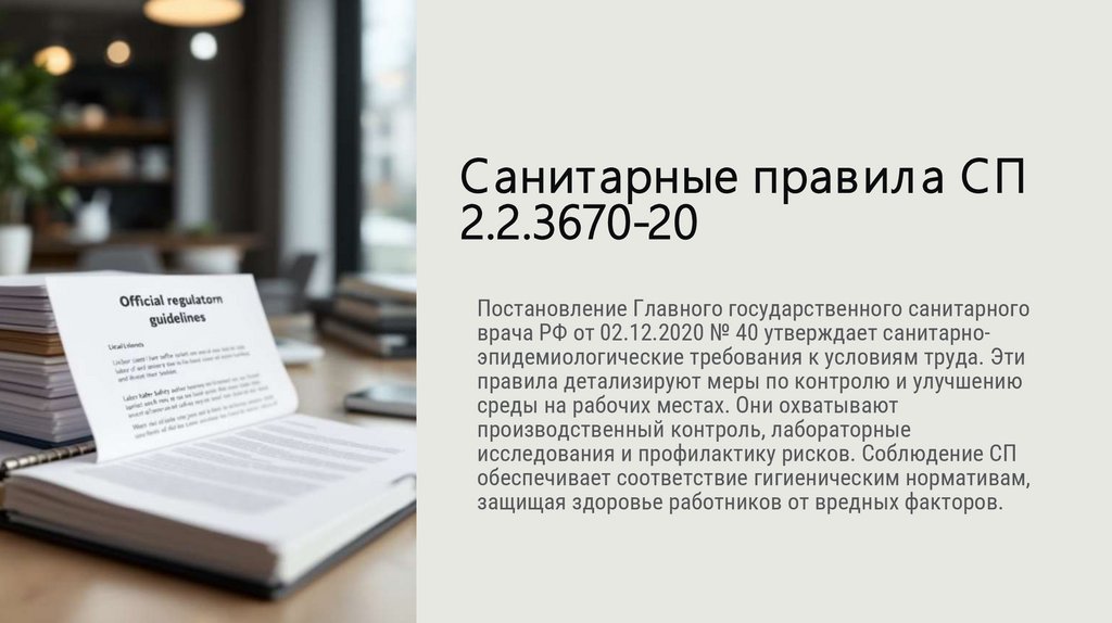 врача РФ от 02.12.2020 № 40 утверждает санитарноэпидемиологические требования к условиям труда. Эти
