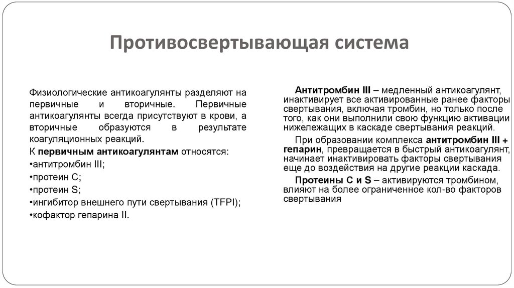 Противосвертывающая системаФизиологические антикоагулянты разделяют на