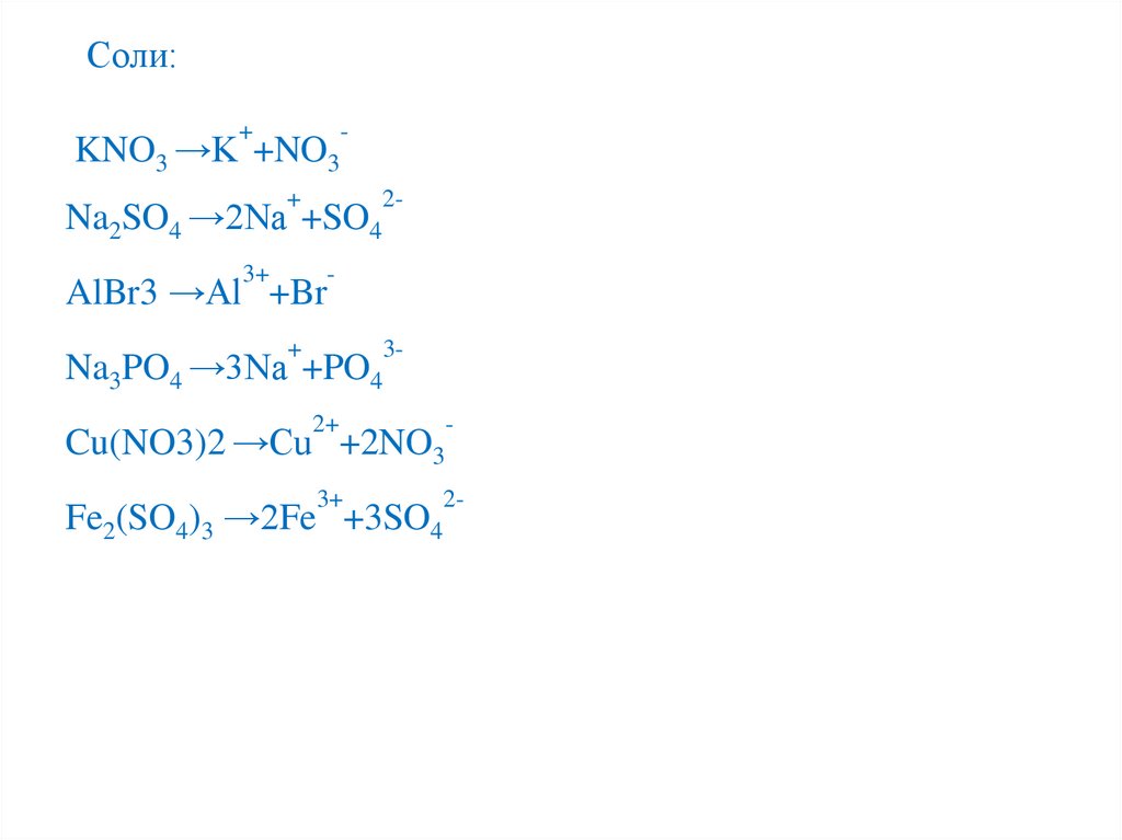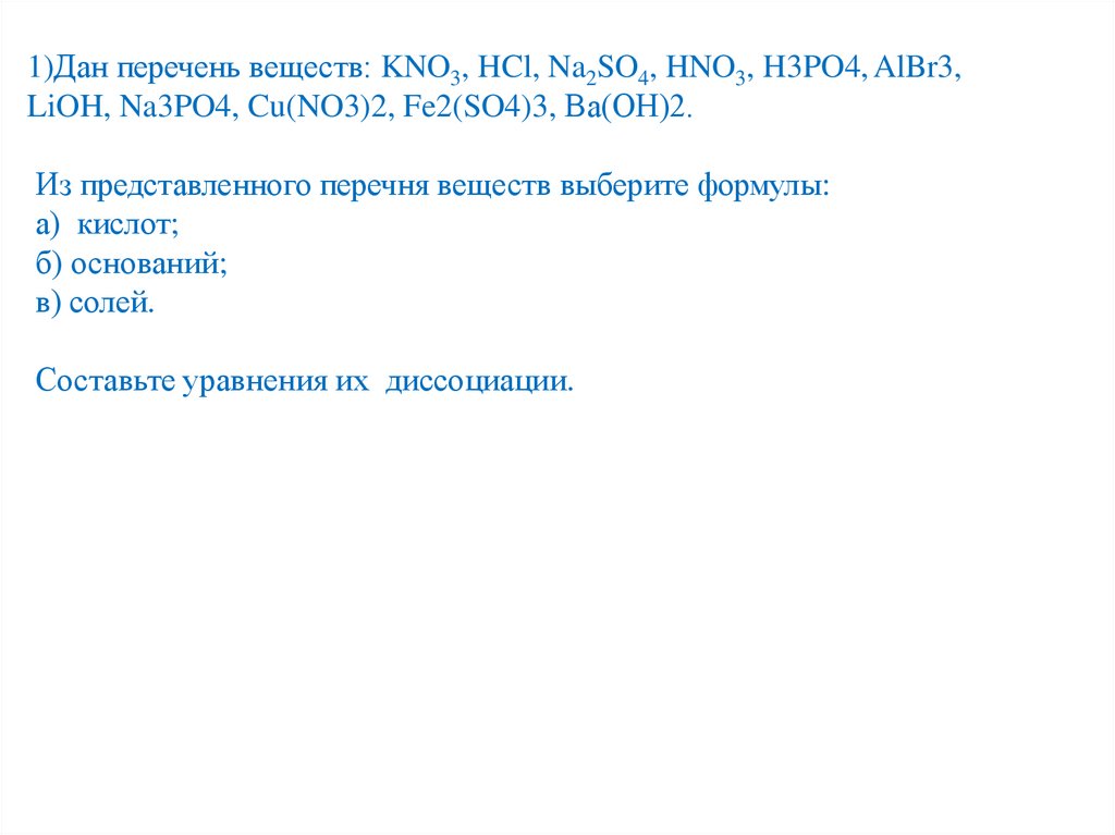1)Дан перечень веществ: KNO3, HCl, Na2SO4, HNO3, H3PO4, AlBr3,LiOH, Na3PO4, Cu(NO3)2, Fe2(SO4)3, Ва(ОН)2.