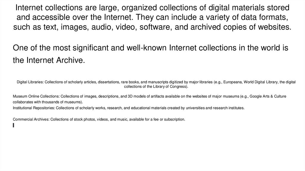 Internet collections are large, organized collections of digital materials storedand accessible over the Internet. They can include a variety of data formats,