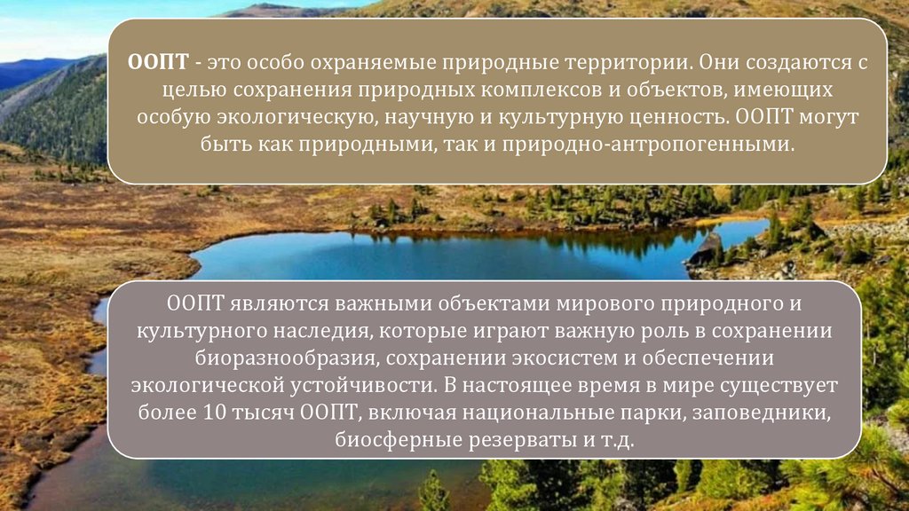 ООПТ - это особо охраняемые природные территории. Они создаются сцелью сохранения природных комплексов и объектов, имеющих