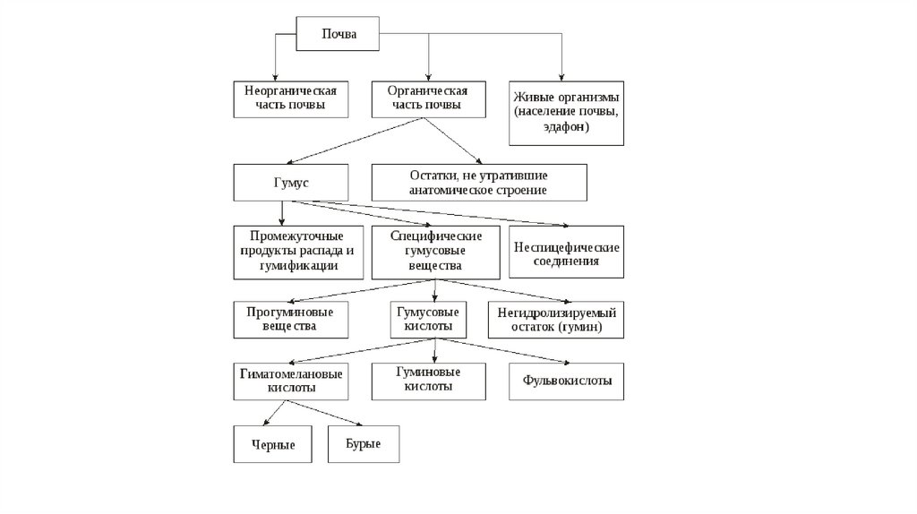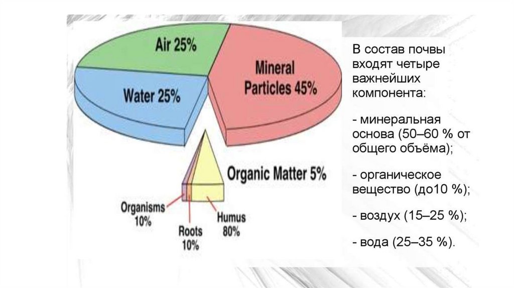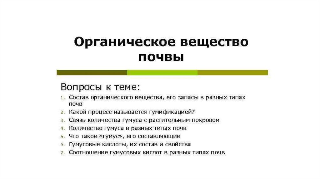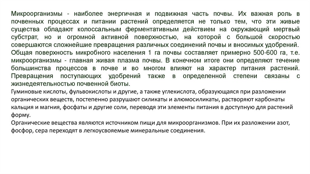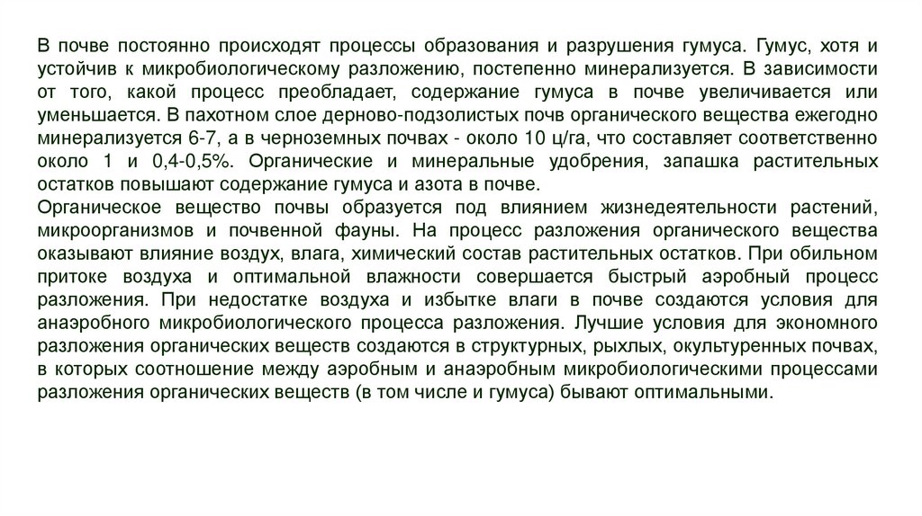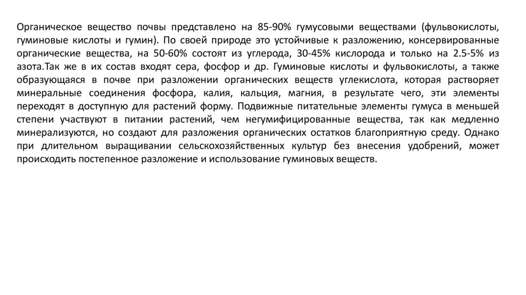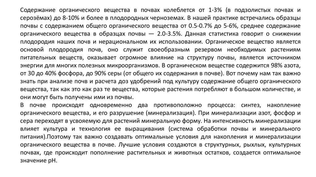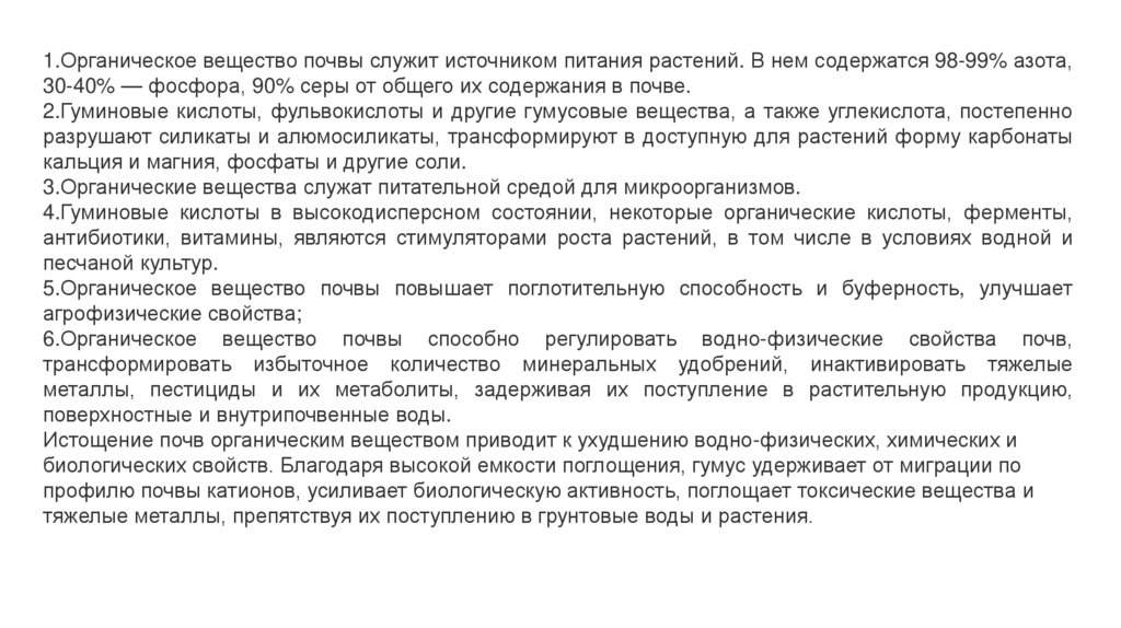 1.Органическое вещество почвы служит источником питания растений. В нем содержатся 98-99% азота,30-40% — фосфора, 90% серы от общего их содержания в почве.