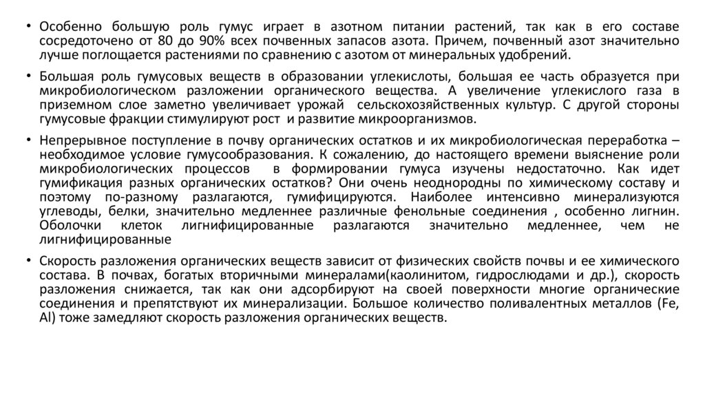 • Особенно большую роль гумус играет в азотном питании растений, так как в его составесосредоточено от 80 до 90% всех почвенных запасов азота. Причем, почвенный азот значительно