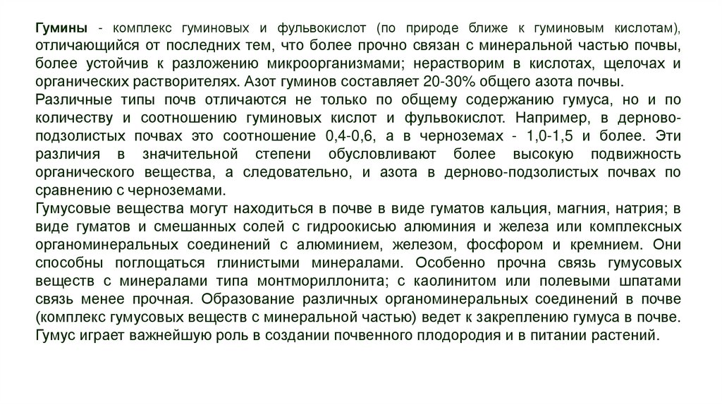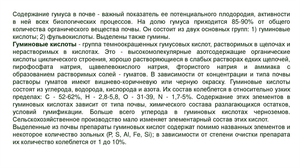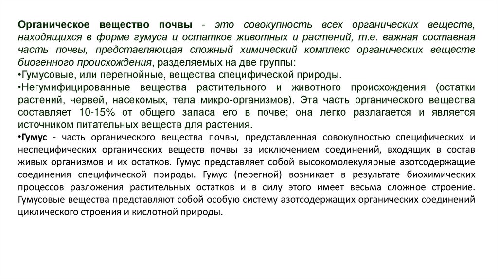 •Гумус - часть органического вещества почвы, представленная совокупностью специфических и