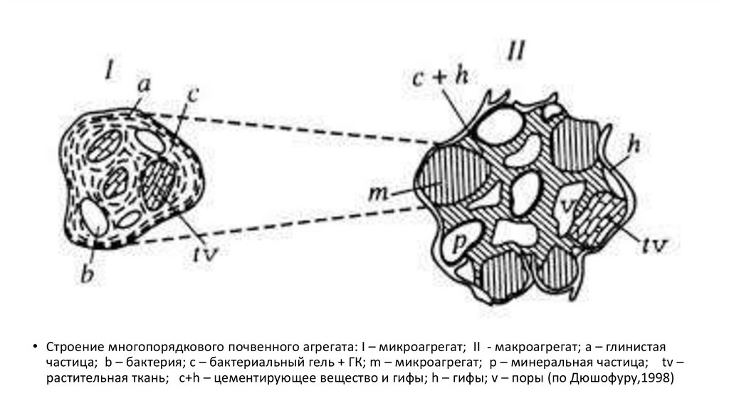 • Строение многопорядкового почвенного агрегата: I – микроагрегат; II - макроагрегат; a – глинистаячастица; b – бактерия; с – бактериальный гель + ГК; m – микроагрегат; p – минеральная частица; tv –