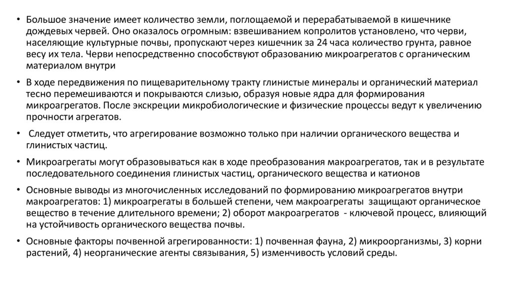 Образованию микроагрегатов способствуют дождевые черви, пропуская через пищеварительный тракт