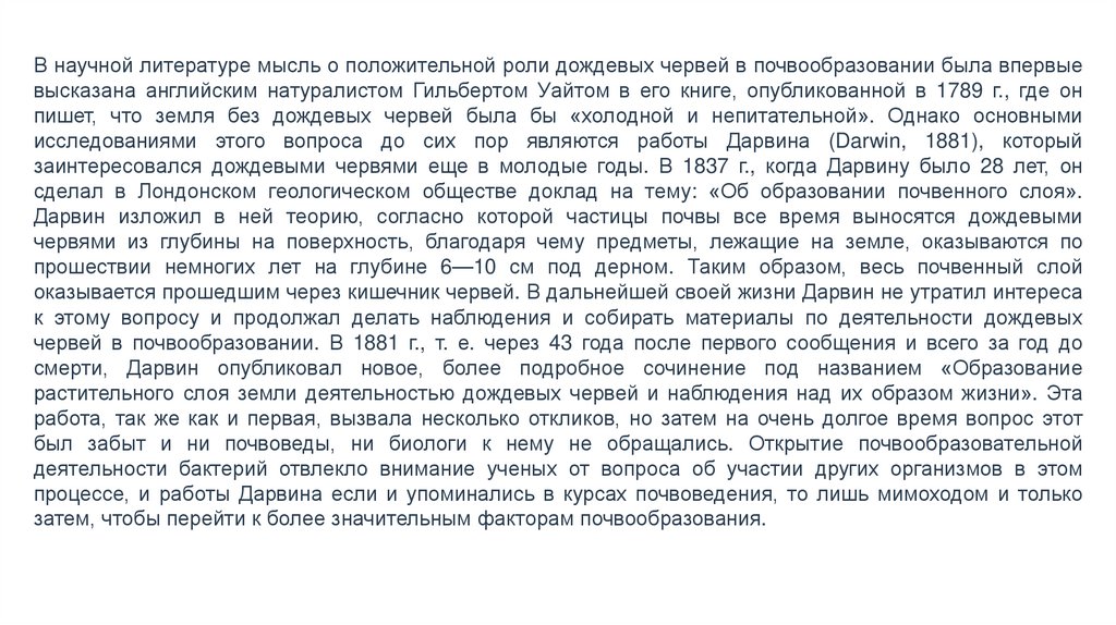 процессе, и работы Дарвина если и упоминались в курсах почвоведения, то лишь мимоходом и только