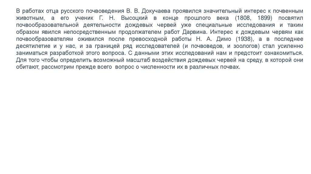 В работах отца русского почвоведения В. В. Докучаева проявился значительный интерес к почвеннымживотным, а его ученик Г. Н. Высоцкий в конце прошлого века (1808, 1899) посвятил