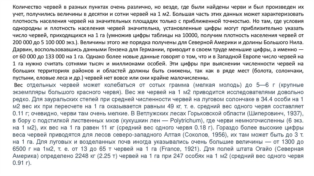 Количество червей в разных пунктах очень различно, но везде, где были найдены черви и был произведен ихучет, получились величины в десятки и сотни червей на 1 м2. Большая часть этих данных может характеризовать