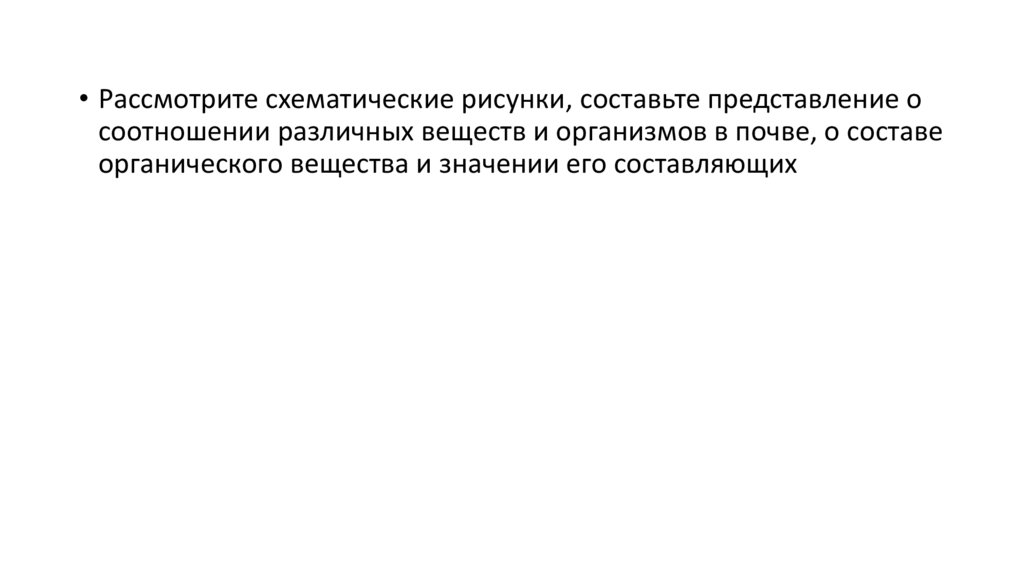 • Рассмотрите схематические рисунки, составьте представление осоотношении различных веществ и организмов в почве, о составе