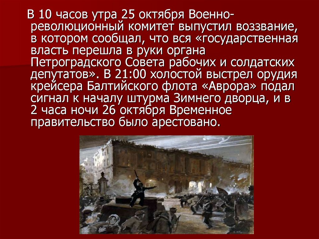 В 10 часов утра 25 октября Военнореволюционный комитет выпустил воззвание,в котором сообщал, что вся «государственная
