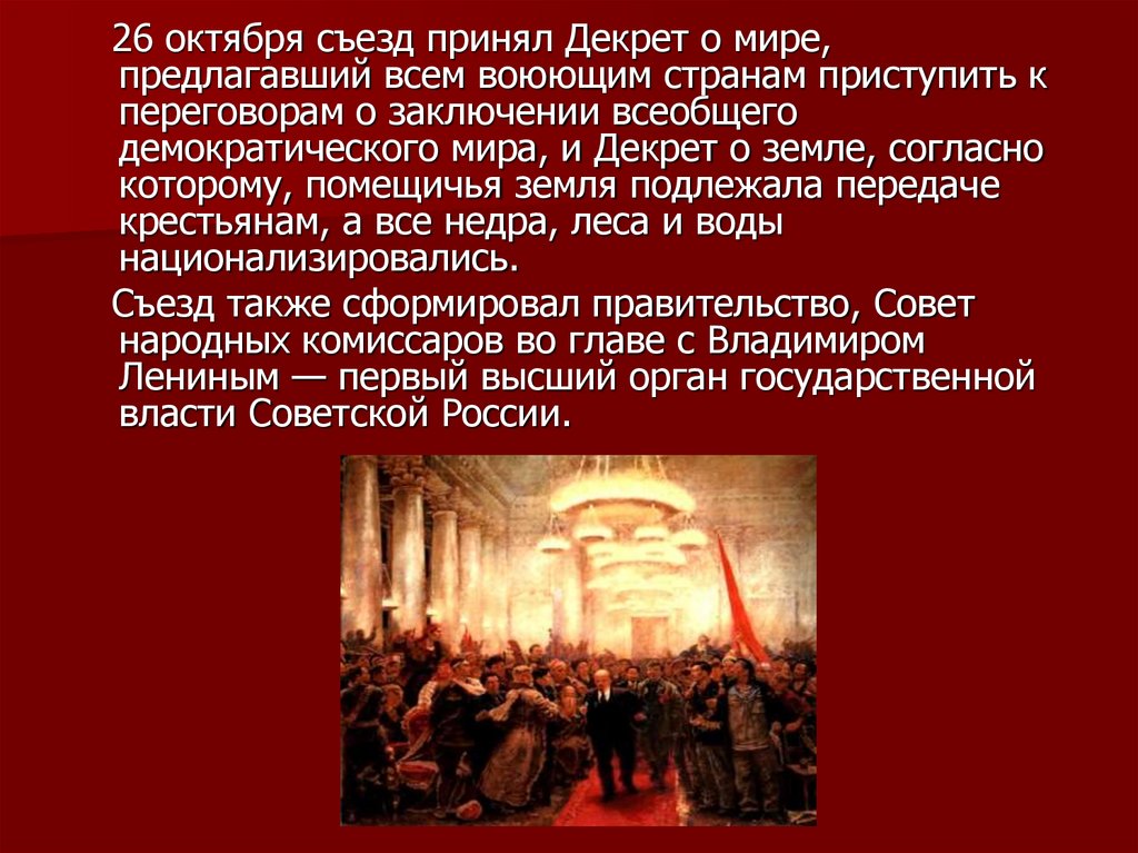26 октября съезд принял Декрет о мире,предлагавший всем воюющим странам приступить к