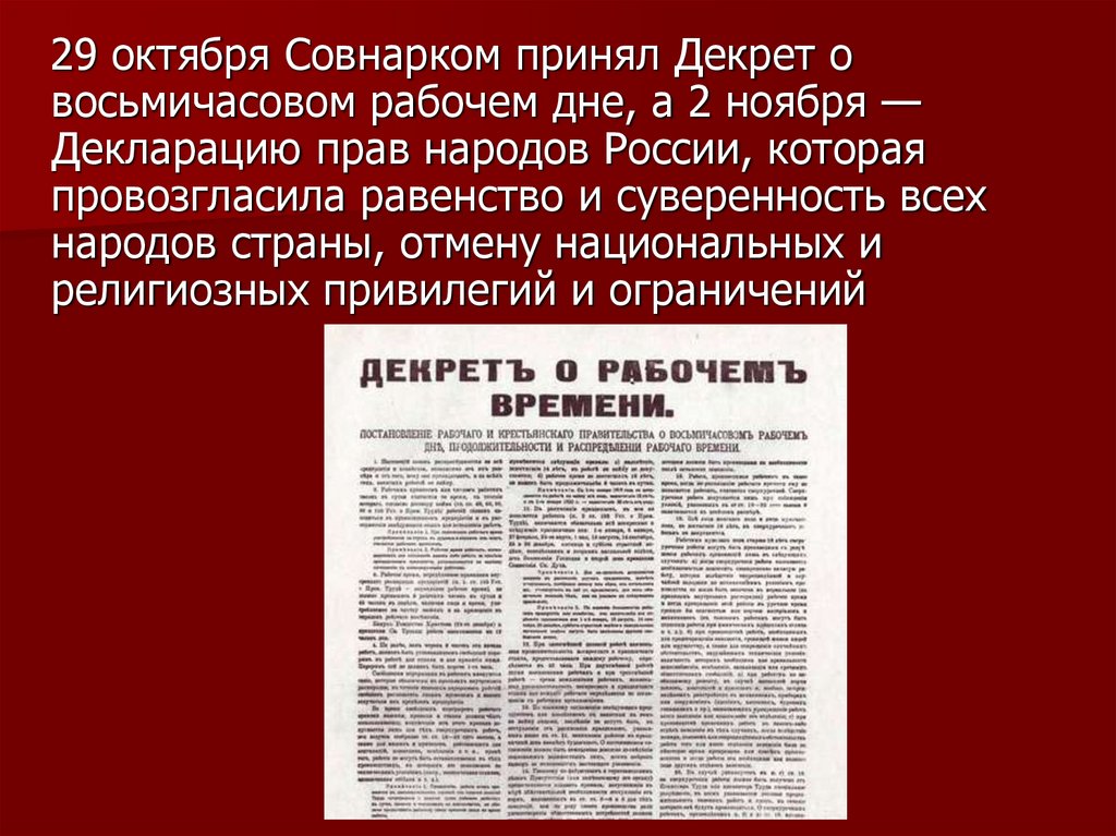 29 октября Совнарком принял Декрет овосьмичасовом рабочем дне, а 2 ноября —