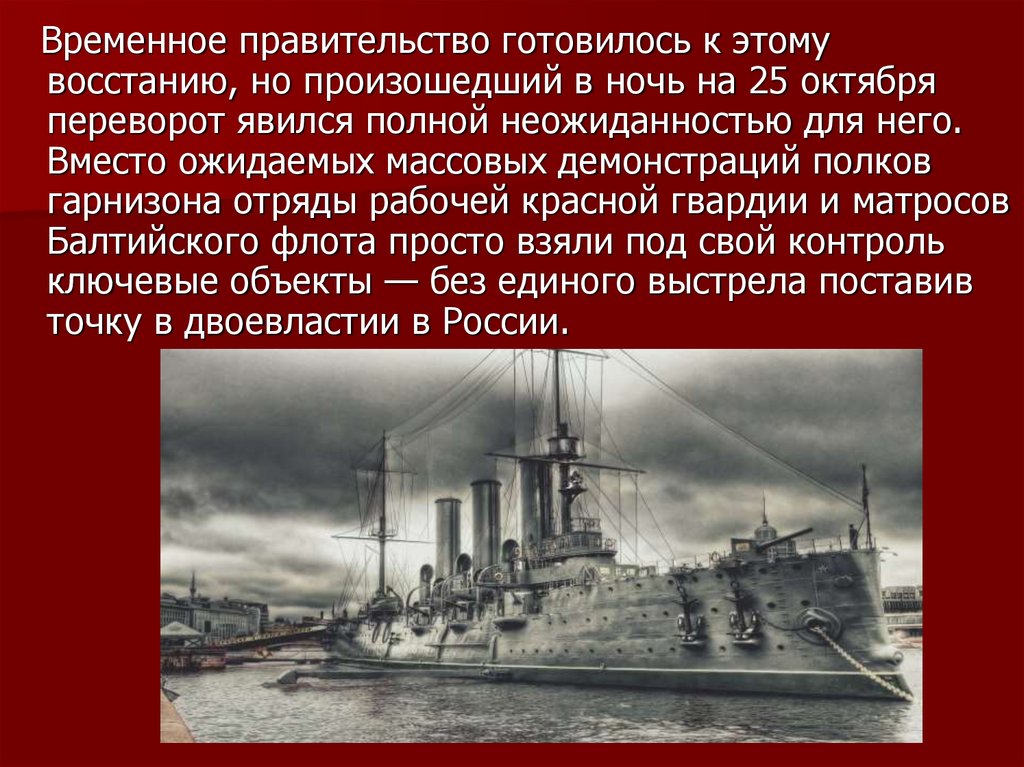 Временное правительство готовилось к этомувосстанию, но произошедший в ночь на 25 октября