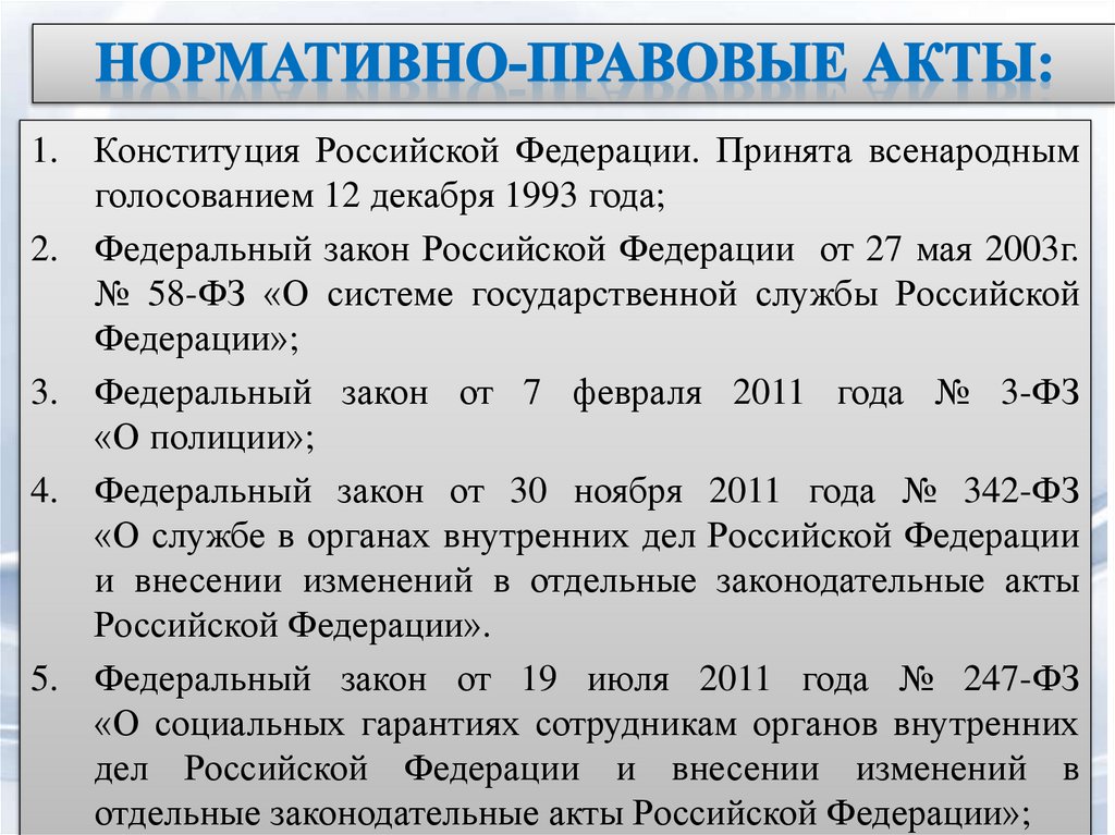 1. Конституция Российской Федерации. Принята всенароднымголосованием 12 декабря 1993 года;