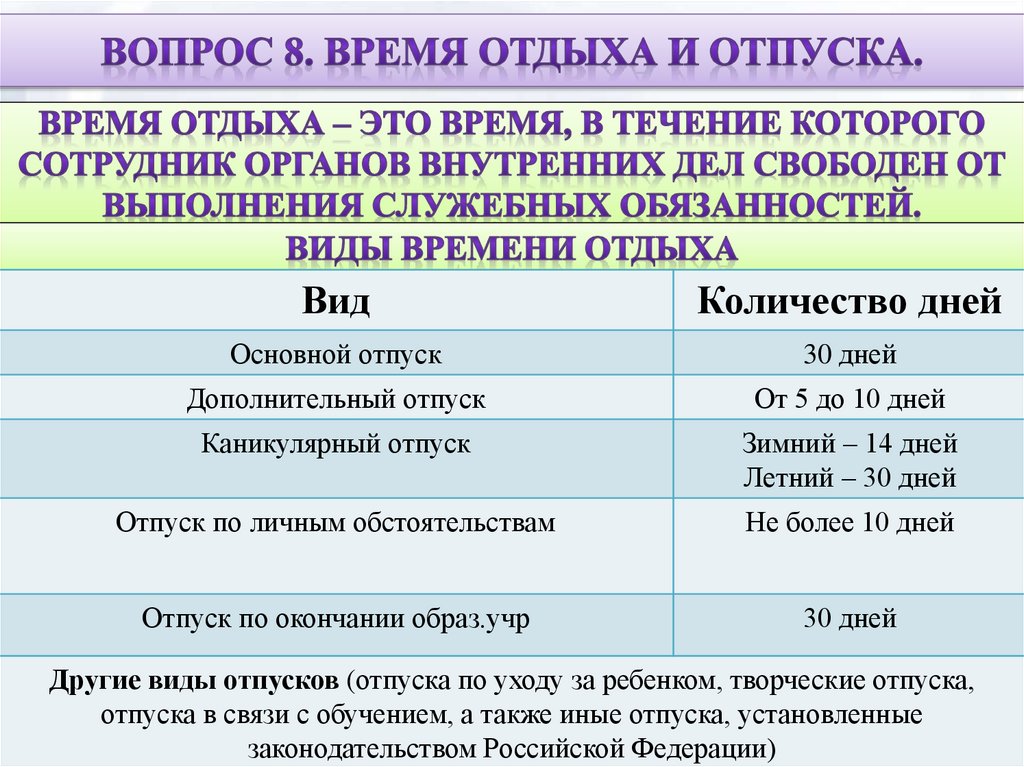 Вопрос 8. Время отдыха, отпуска на службе в органах внутренних