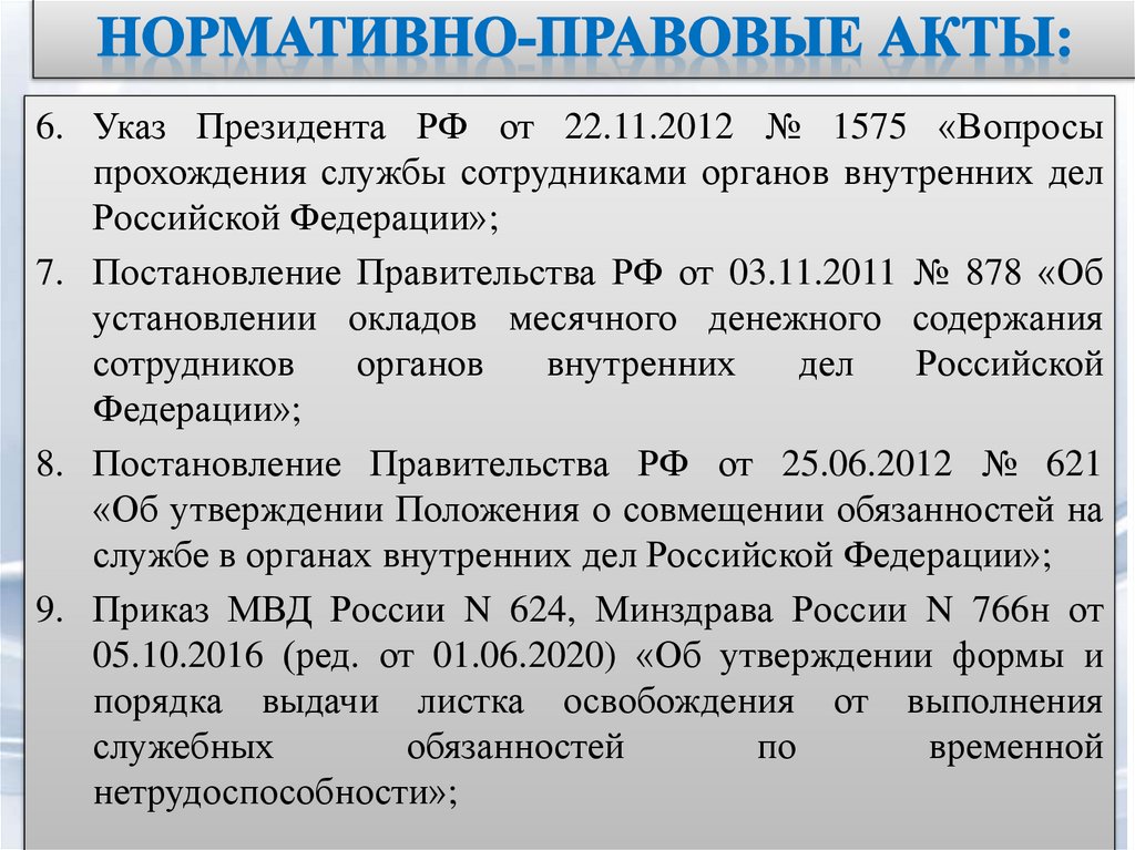 6. Указ Президента РФ от 22.11.2012 № 1575 «Вопросыпрохождения службы сотрудниками органов внутренних дел