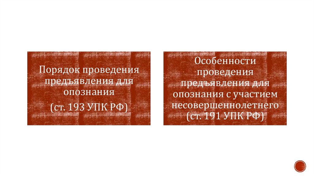 11. предъявление для опознания (живых людей, предметов, документов, трупа, животных) – ст. 193 УПК РФ;